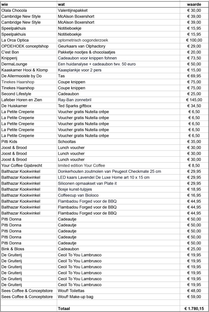 Hierbij een overzicht van alle prijzen: